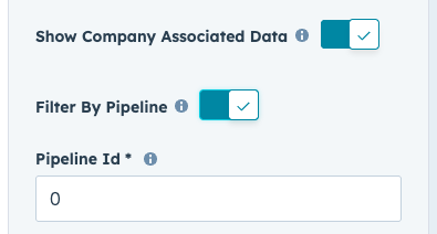Toggle Filter by Pipeline on and enter a Pipeline ID (copy from WoodsPortal Admin > HubSpot Objects > [Object] > Configure > Pipelines).