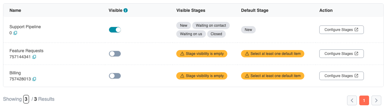| Default Stage dropdown is empty | Toggle at least one stage to Visible before setting a default. |