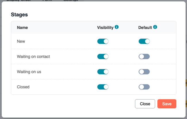 In the stages list, toggle Visible on for any stage you want portal users to see.