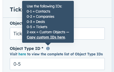 For custom objects, find the ID in WoodsPortal Admin > HubSpot Objects > Custom Objects.