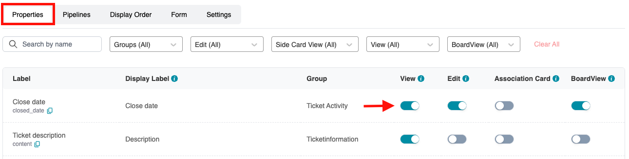 In the Board View section, toggle Display on for each property you want as a card or lane.