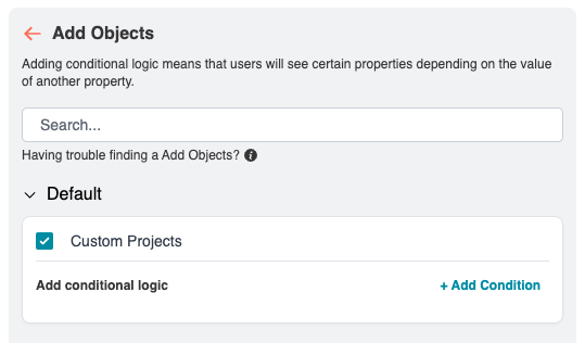 To include a related custom object (e.g., Custom Project), click its name to add a dropdown.